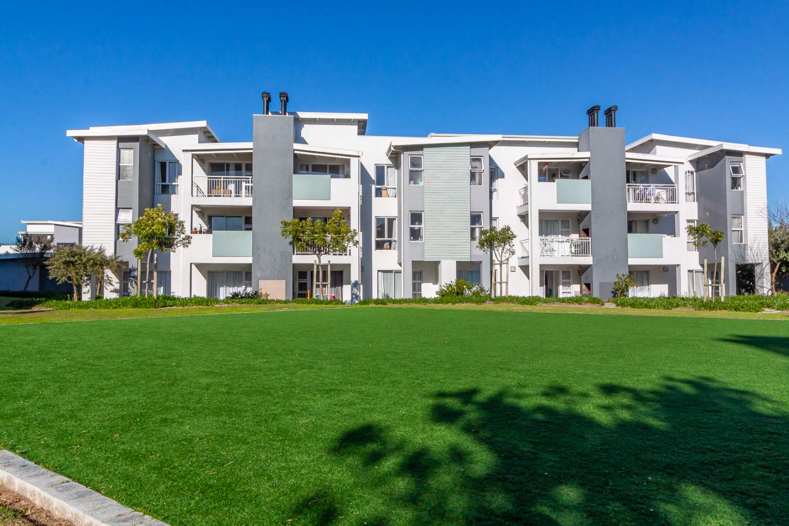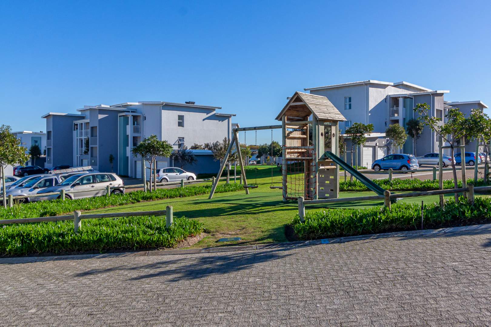 The complex offers large green open space, a sizeable swimming pool, braai facilities and a play park with a jungle gym.